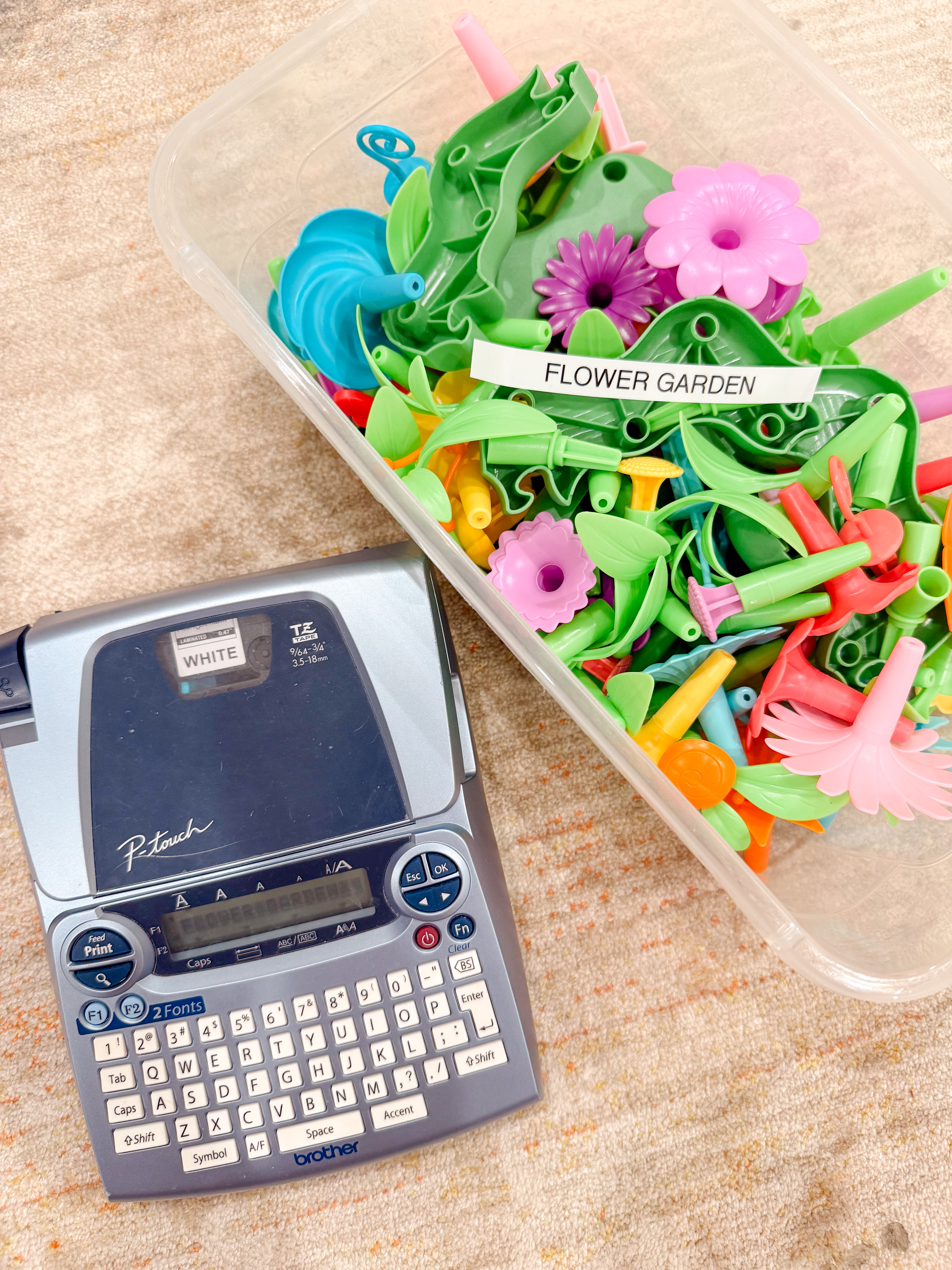 Armed with some clear plastic shoe bins from Target and the trusty label maker we’ve literally had since our days teaching elementary school…